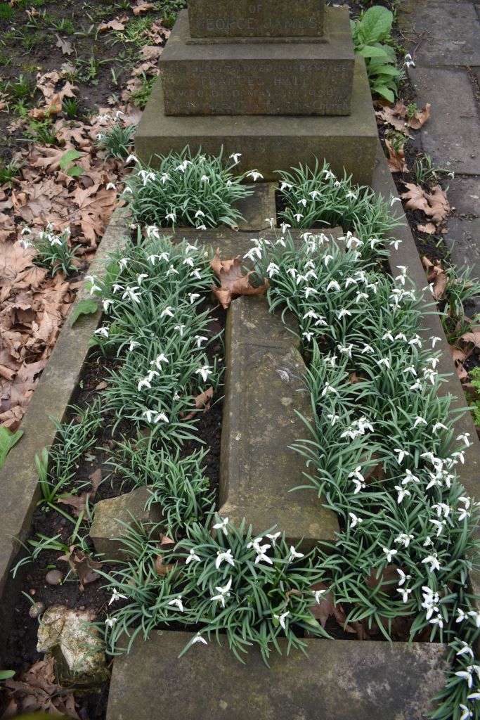 But continuing last month’s theme of snowdrops, this was a lovely planting of them that I saw in St George’s churchyard in Beckenham Kent in February 2026. They are on the grave of George James. The cross has obviously fallen at some point and I love the way in which the flowers have grown up around it and emphasised its shape. Churchyards can often have magnificent displays of snowdrops in February which is one of the first signs of Spring.