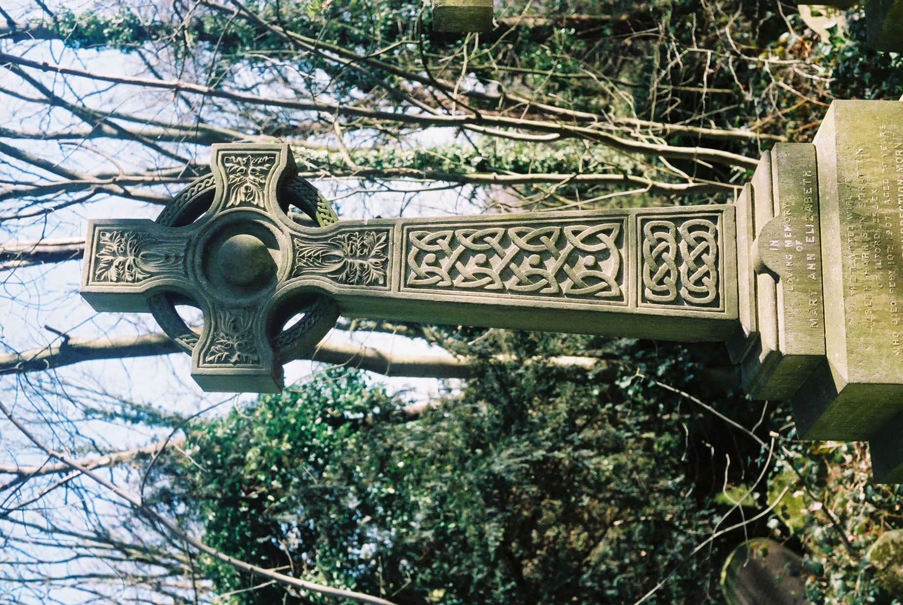 However, as the 19th century wore on, the rules slowly relaxed and in the 1880s angels began to roost. Some were copied from Italian originals as is a magnificent and sensuous example in West Norwood Cemetery. The revival in Celtic arts meant that Celtic crosses, in which the arms formed a wheel, came back into fashions. There was also the language in which every flower had a meaning as with ivy which was a symbol of immortality or evergreen memories.