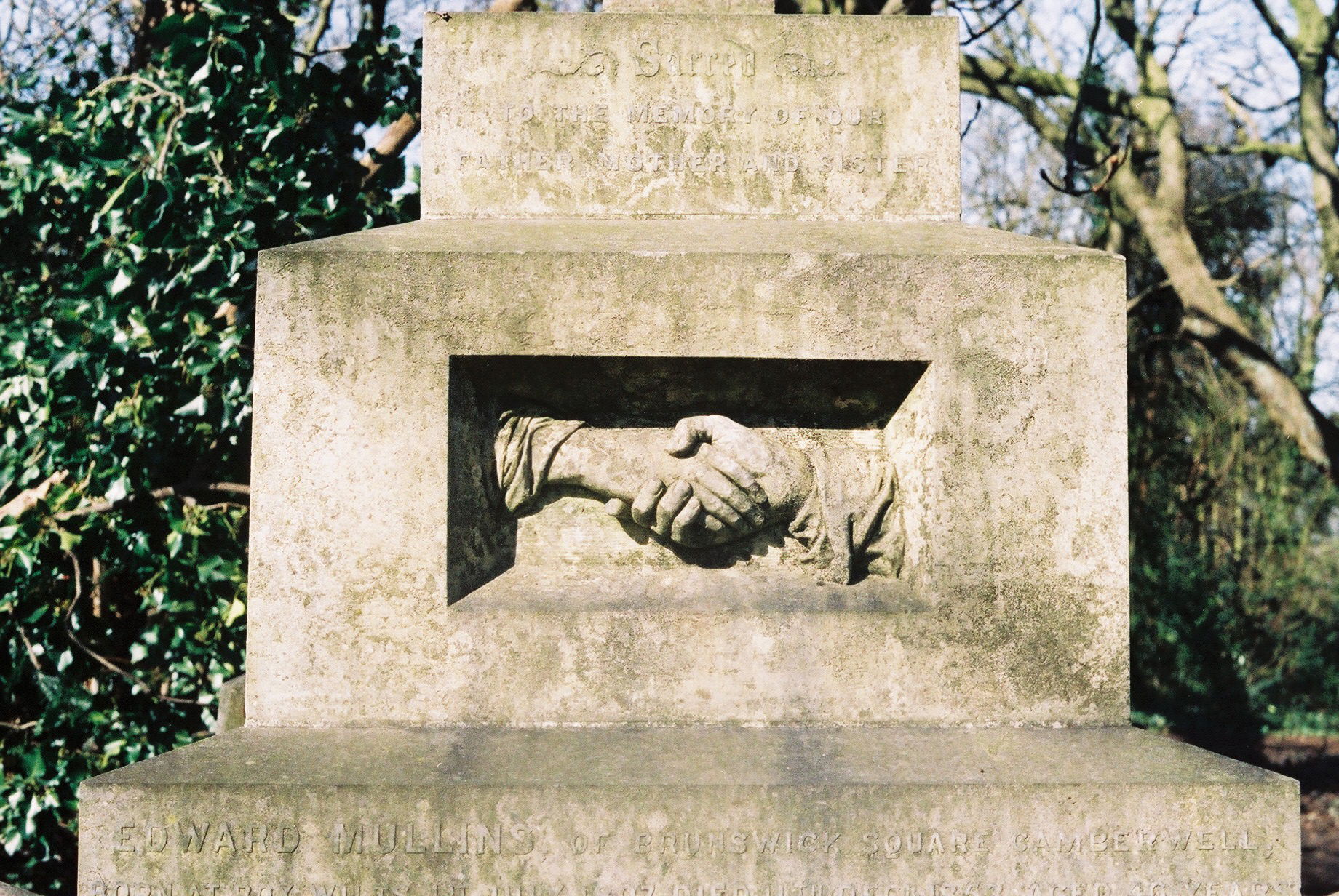 4.Shaking hands. A particularly striking and beautifully carved example is on the Edward Mullins vault. There are several examples within Nunhead but these are the best in my opinion. There are several interpretations of this image: they may mean ‘Farewell’, marriage, a close bond lasting until death or the first one to die holds the surviving spouse’s hand guiding them to heaven. If on a family tomb, as they usually are, they can mean either hope or reunification in the next life or simply ‘see you soon’ which may not be as comforting as it sounds with the Victorians high mortality rate.