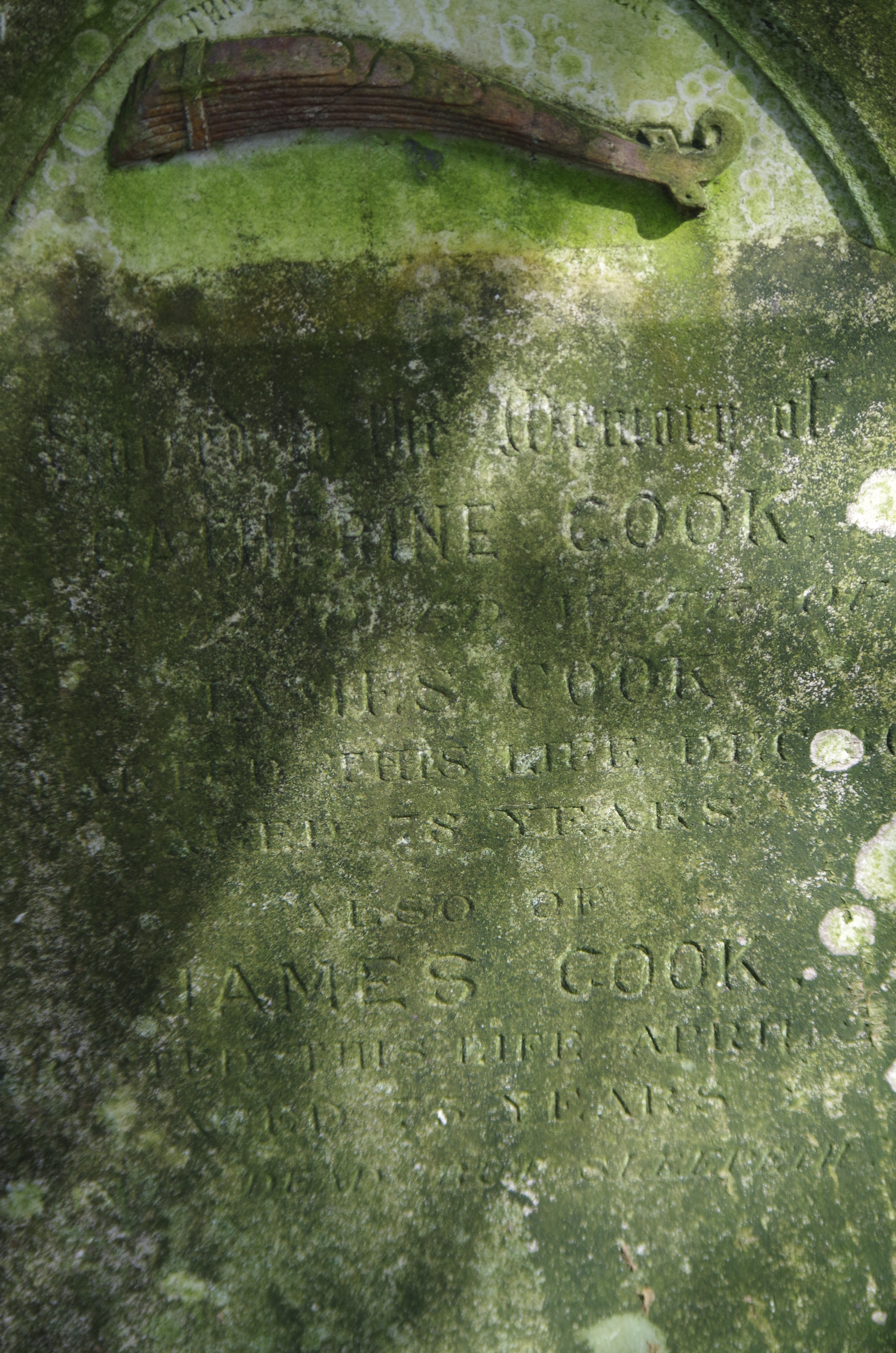 It’s a memorial to Catherine Cook, beloved wife of James Cook as it says on the epitaph, with the motto ‘The Spring of Life is broken’ and the carving above it with a lovely border of carved ivy leaves representing ‘evergreen’ or ‘eternal.’