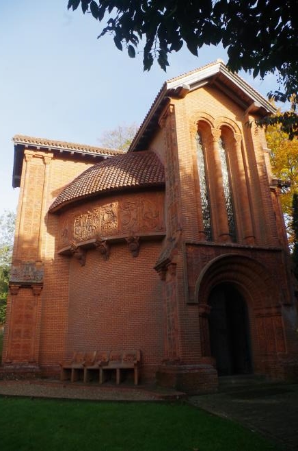The Grade 1 listed chapel is best viewed on a sunny day when its terracotta walls turn to orange and the dazzling reliefs, figures and symbols on the frieze around its exterior become three dimensional. Walk around the outside of the chapel and marvel at the sumptuous combination of Celtic, Art Nouveau and Romanesque patterns and styles. The calm faces of angels look down surrounded by stylised animals, birds and labyrinths.