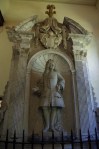 The carving on Sir William’s cravat, cuffs and wig as well as the delicate lacing of the Grecian style boots on two life size allegorical female figures or Virtues on either side of him is beautifully detailed. However, his opposite neighbour, Sir George Strode, has a wig that reminds me of waves of whipped cream. Both men face each other and lie in the fashion of old style glamorous Hollywood stars with their rumpled marble sheets and supporting cushions. But, perhaps in a feat of one-upmanship, William’s shrine is bigger than George’s as it’s laden down with figures and decoration such as the two Virtues dressed in flowing robes and showing a fair bit of leg. There are also 3 winged cherubs heads under the cartouche decorated roof with swags of fruit and flowers. But if you look up still further there are two small female figures, possibly children, perched on top of the roof and one appears to be playing an accordion. The English translation of the Latin epitaph is: