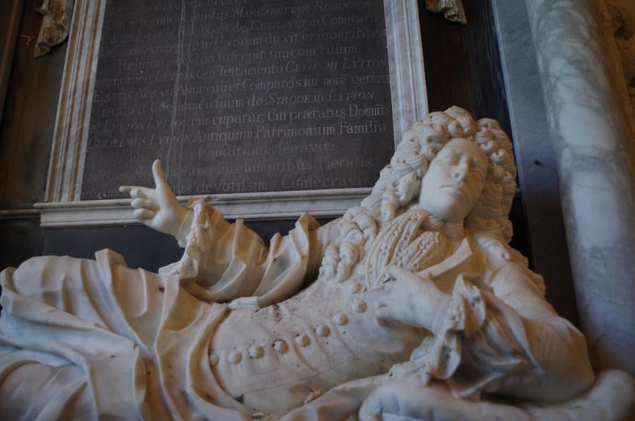 Everywhere I looked, as I stood in the Lytton Chapel, a well-upholstered, well dressed 18th century gentleman stared impassively back at me. They seemed to jostle for space in the small chapel and, although these past members of the Lytton family, couldn’t take it with them, you certainly knew that they’d had it when they were alive. These were powerful men and there’s plenty of beautifully sculpted marble on show in the Chapel. Nowadays, people would ask an artist or sculptor to make them look slimmer but here the subjects are unashamedly larger than life.