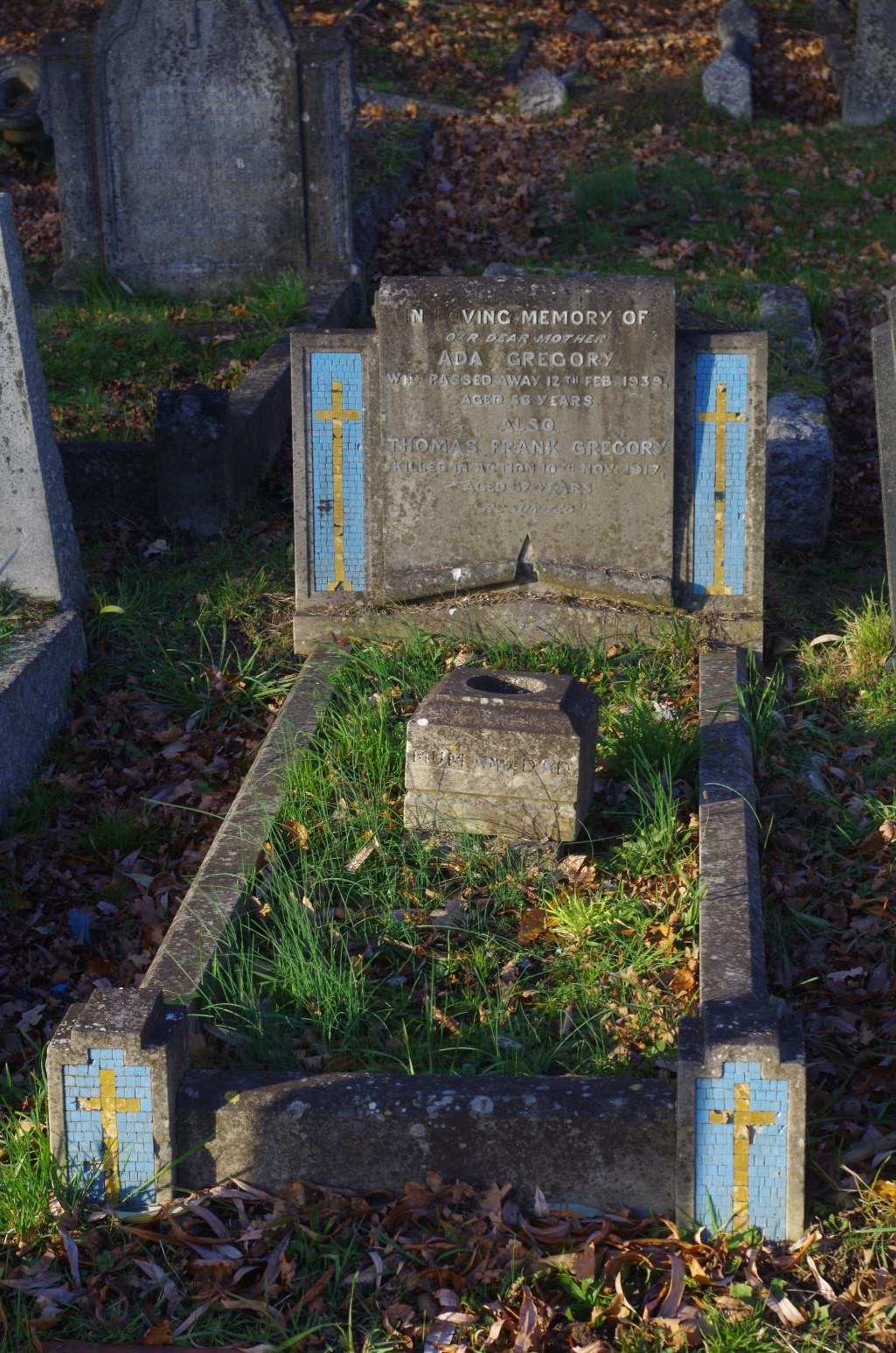 And more golden crosses on each of the corners of Ada Gregory’s monument. She died in February 1939 but her husband, Thomas, who was killed in action in November 1917 is also commemorated here. As the final line of the epitaph states ‘ Reunited.’
