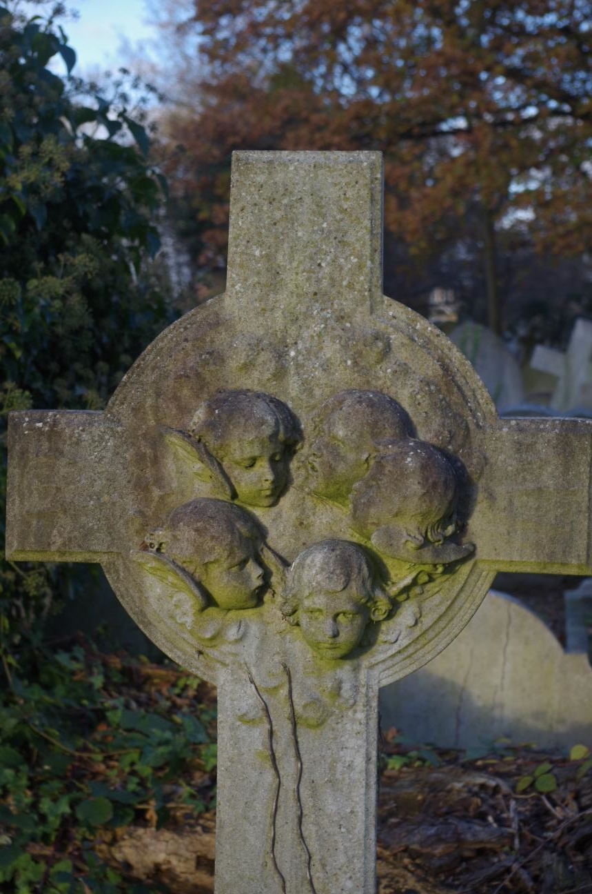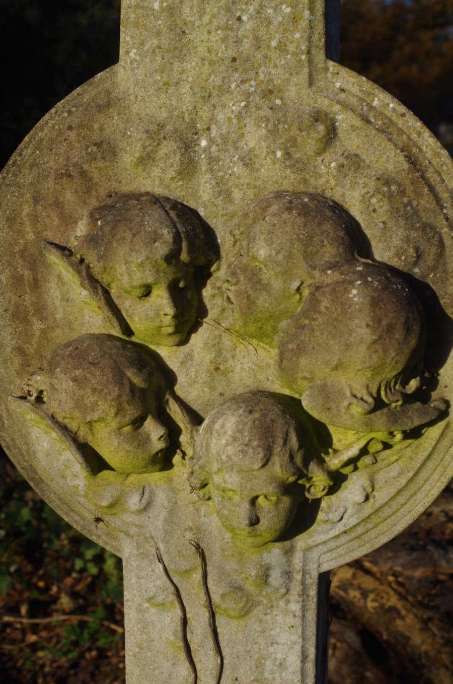 Five child angels, their faces turned to each other, framed by small wings, except for one that was staring out at me, I wanted to reach out and touch them but didn’t want to damage them. They formed a roundel at the centre of a tall cross with the phrase ‘And with the morn those angel faces smile’ inscribed at the base of its stem. I was on a tour of Beckenham Cemetery when I first saw them.