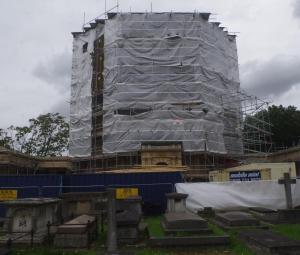 Back view of the chapel swathed in plastic – the East and West wings can be seen flanking it on either side.