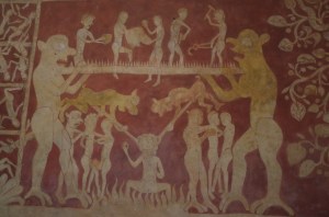 The priest’s sermon has made you feel a little drowsy as you sit in your pew. Then, as your eyelids begin to droop, suddenly you can smell burning and hear crackling flames….faint screams as well and devilish chuckling interspersed with angels singing…..there’s a sudden warmth behind your back and when you turn around, you’re confronted with gleeful demons faces on the whitewashed wall. Is one turning round and beckoning to you? Instantly you’re wide awake again with a nudge from your mother to sit up straight and you turn to face the priest again. But you can still hear the flames and the laughter…..