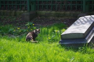 There is a part of West Norwood Cemetery which backs onto a small row of houses and so the occupants household pets, cats, come into explore. There’s often a good selection of them on a sunny afternoon; using the cemetery as an extension of their garden while checking each other out, going on the hunt or as their playground. After having disturbed the fox, I caught sight of a fluffy back and white cat on his rounds trotting along a grass path. I tried to keep a discreet distance as he passed Mrs Beeton’s modest memorial and the top of Ship Path. However, as I galumped along, he began to pick up speed. He trotted, more quickly now, across the main path in front of the catacombs and then leapt gracefully onto the wall above them. He looked back as if to say ‘Too late!’ and then vanished over it.