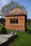 As I ate my lunch whilst admiring the crimson blossom on a tree nearby I could hear an old lawnmower in the distance. As I got up and came around to explore another large cleared area I saw a descendant of the Doulton family mowing the grass around the mausoleum. Terracotta always looks at its best in the sunshine and today it looked almost on fire.