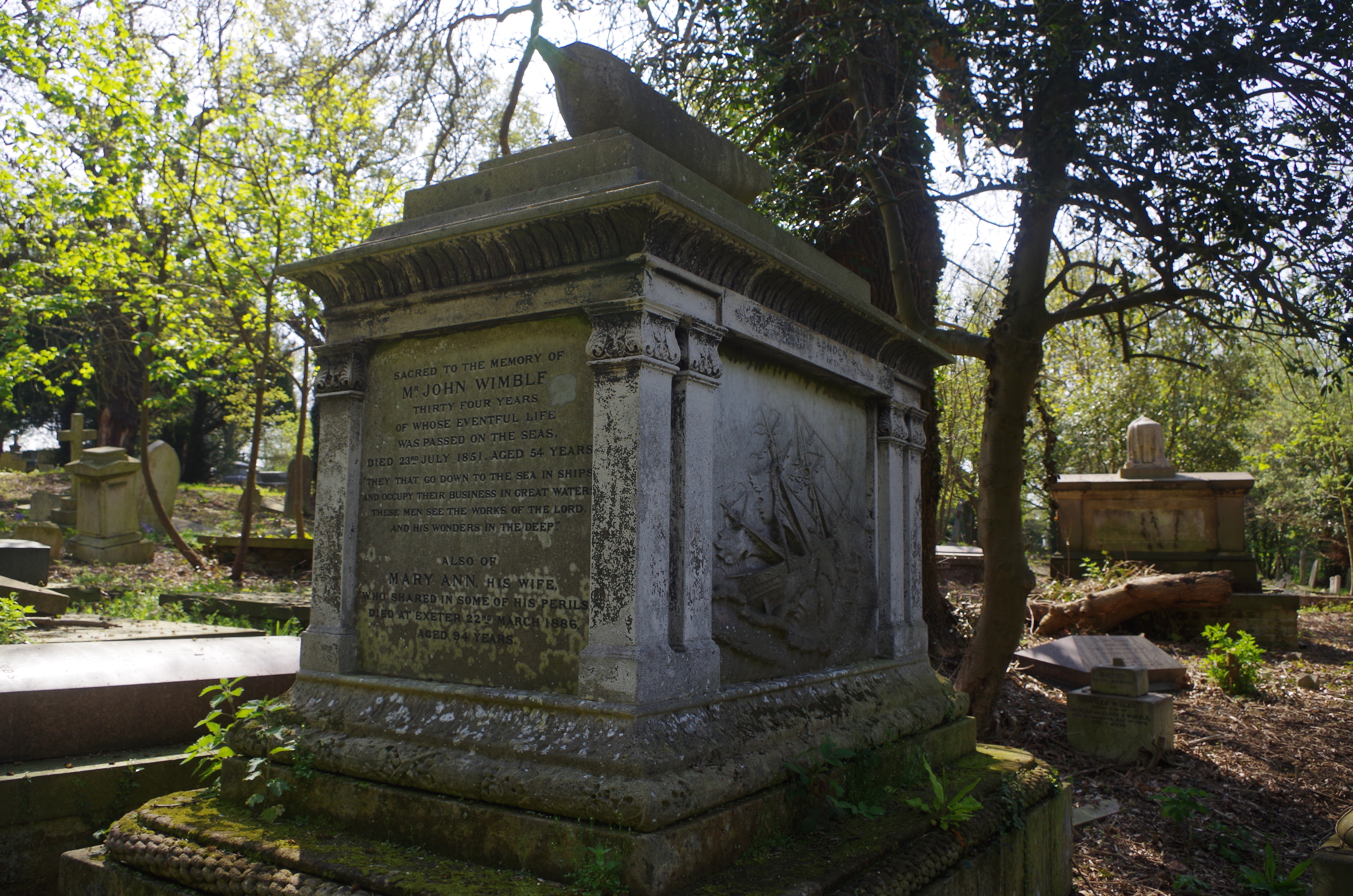 Orange Tips, Holly Blues and the odd Brimstone, the first butterflies of the year, impressed me with their speed and acrobatics. One Holly Blue dived under a spreading rug of plants that covered last year’s forgotten or discarded horse chestnuts and dead leaves. There has been a lot of clearing going on in West Norwood and it was like rediscovering it again as I found memorials and monuments that I had never previously seen as they’d been hidden under ivy, brambles and other vegetation. The clearances have made it much easier to get to the back of Captain Wimble’s exuberant and magnificent tomb to admire the still crisp carving of one the ships on which he sailed. But more about him and his indomitable wife in a later posting. It is the reason that the grass path that runs past it is named, strangely enough, Ship Path.
