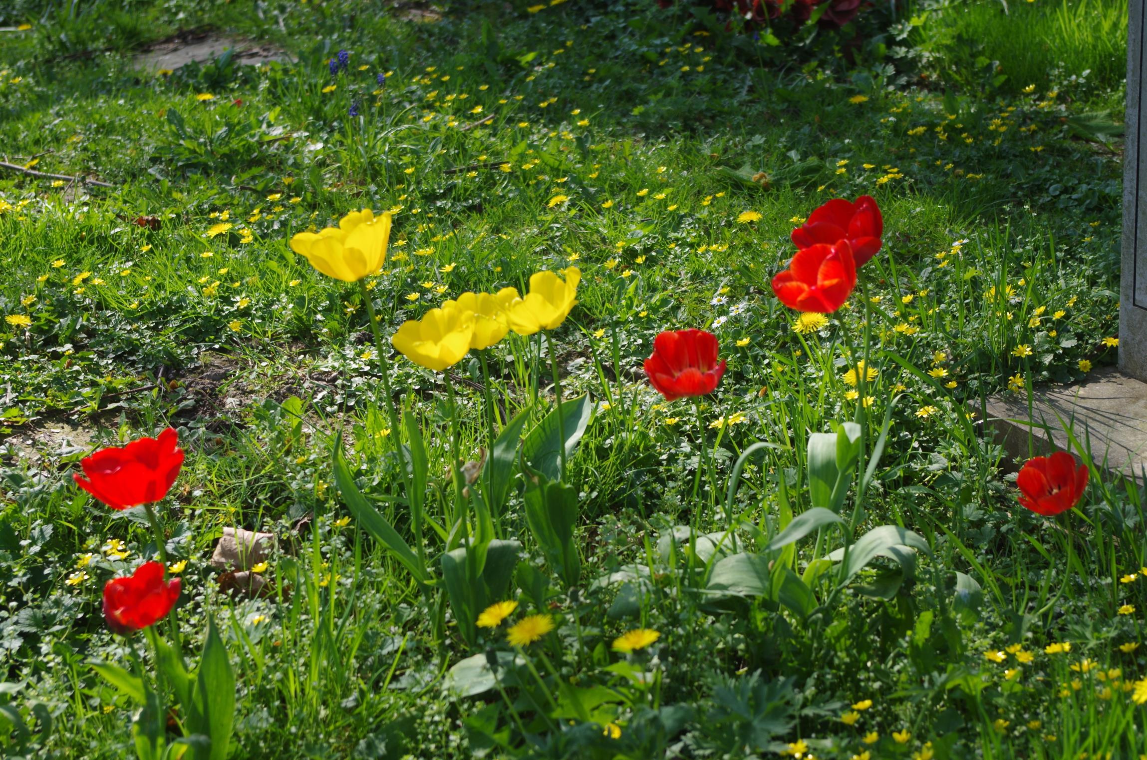 A cuckoo flower was half hidden in the long grass near another glorious display of brilliantly coloured tulips.