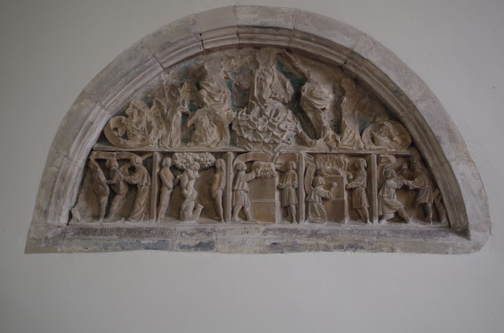 Mounted on a wall was a carved relief with biblical scenes carved on it. These were the strange symbols mentioned in Peter Haining’s Ghosts of Kent. The ones that I could recognise were of Adam and Eve by the tree of knowledge with a strange bird climbing it, Cain and Abel, and Abraham sacrificing his son. The others were too damaged to read. The figures all have little scripts issuing from their mouths – a little like a ancient century comic strip. Nobody’s sure if its 16th century or if it was originally set into a 12th century doorway. I agree with the Kent Archeological Society that it was a tympanum. According to Wikipedia: