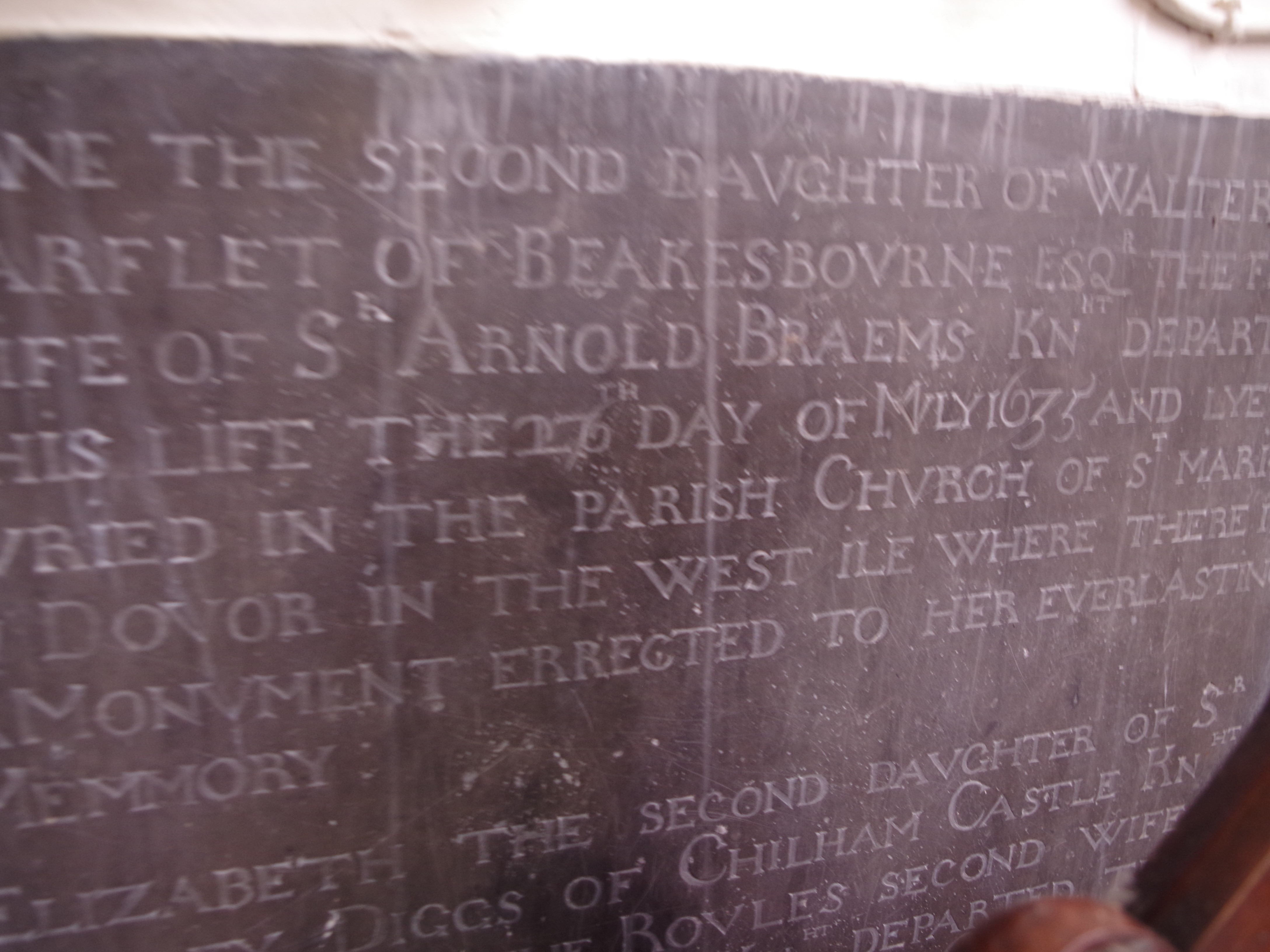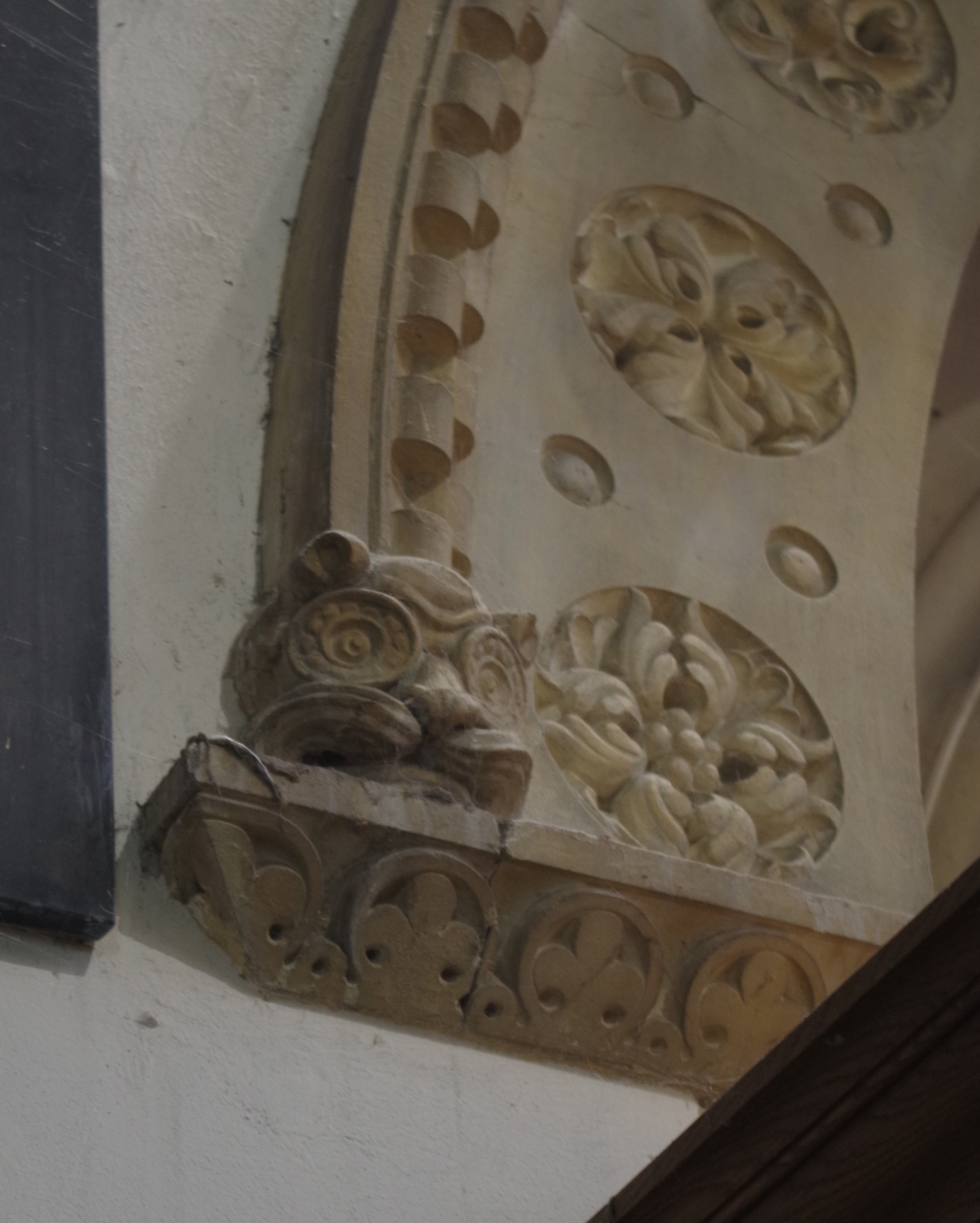 On the other wall of the chancel facing the sculpture were fragments of a relief memorial to another vicar of the church named Malcom Ramsey who died in 1538. He was the vicar of Patrixbourne and Bridge for 44 years. The fragments form part of an inscription.