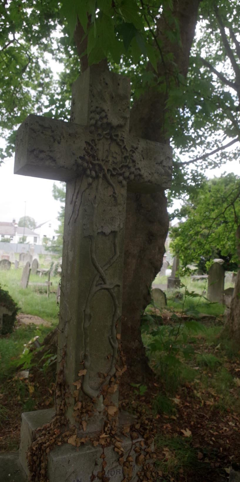 This is less ornate and, instead, features vine leaves cascading on a Celtic cross with again the very ornate combined letters of IHS in the centre of the cross, or the nimbus, with a dedication below to Matilda Morris who died on 10 December 1881. Again I haven’t been able to find out anything about her but research is ongoing.