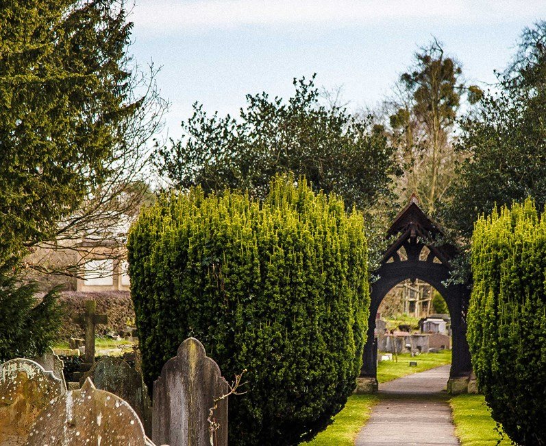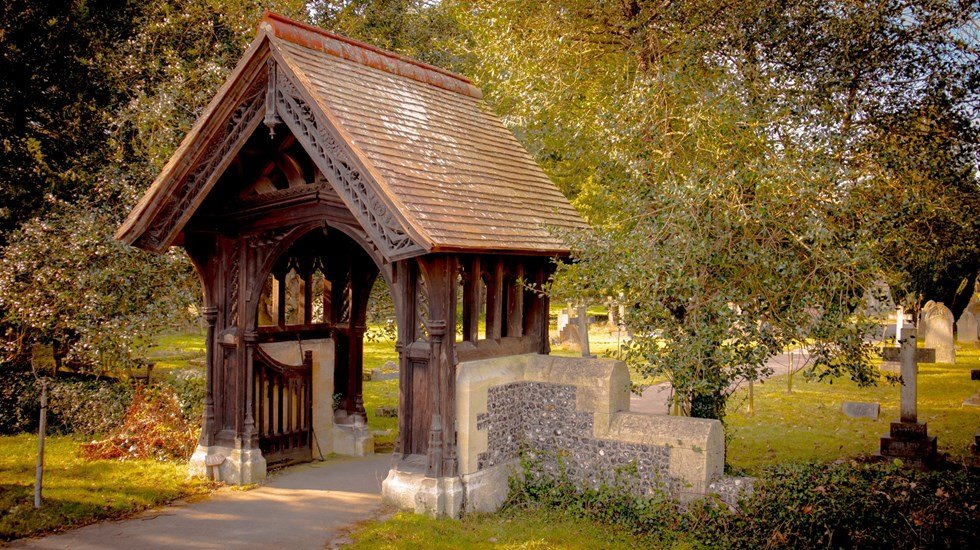 Lych gates are the ornamental gateways which lead to churchyards. They symbolise the threshold between the secular and sacred zones of a parish and once served a practical function of storing a coffin before burial. Their name derives from the Anglo-Saxon or German word for corpse: lich, or leiche.