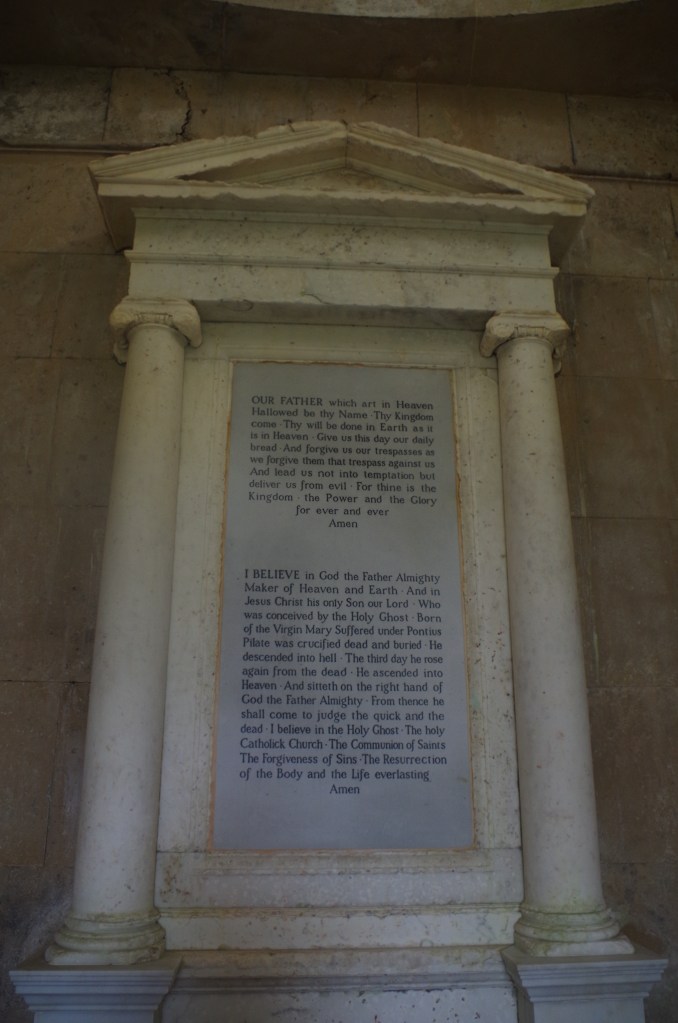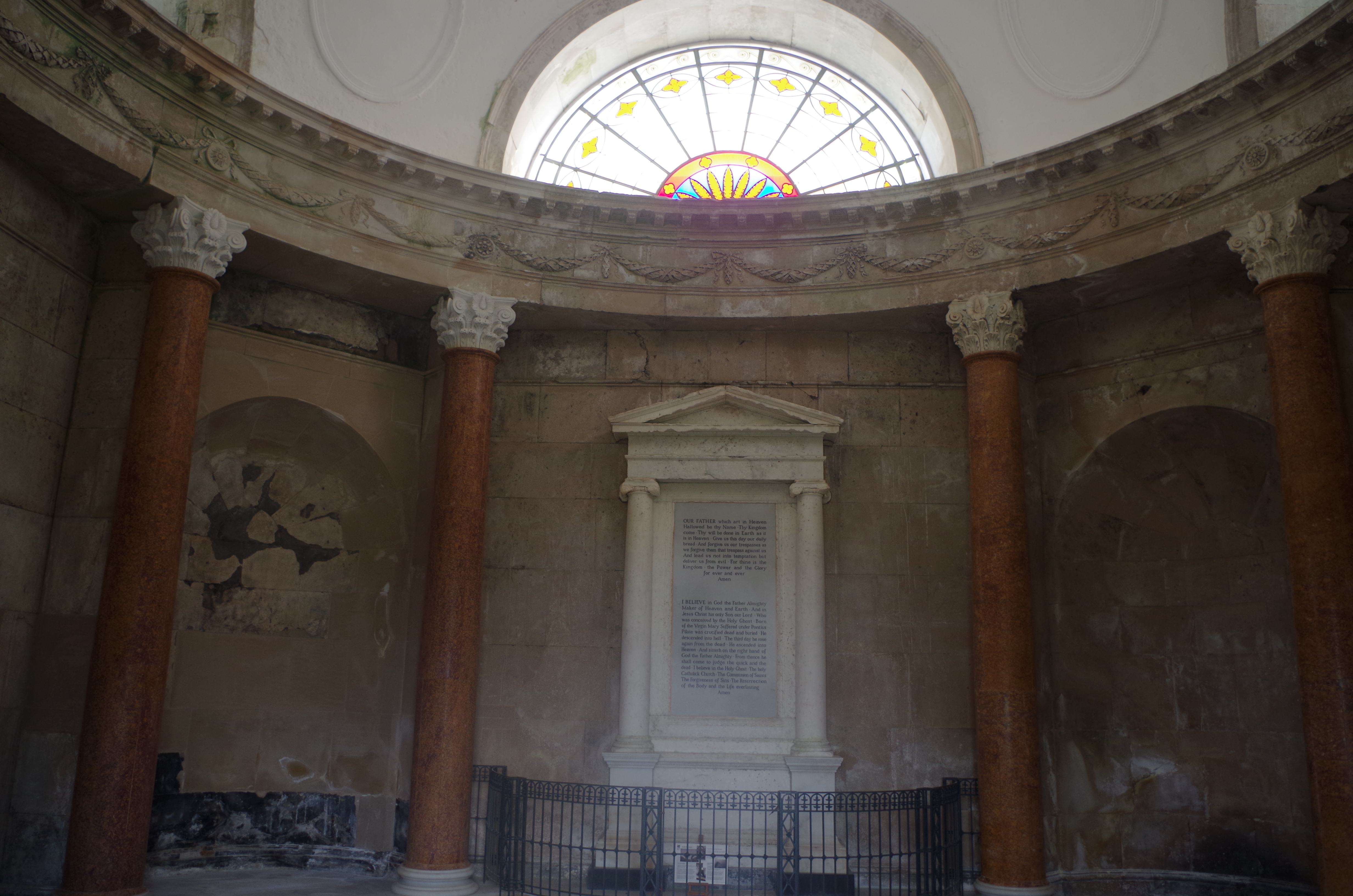I entered the upper chamber or chapel. It was dark inside although the open door and the stained glass windows, or lunettes, above gave the alcoves shadows and an ethereal light. A very tall tablet was in front of me with the Lord’s Prayer inscribed on it. Burn marks from the attempt to blow the building up on Bonfire Night 1990 could still be seen in places on the brick faced Portland stone. I thought that it might have Tardis like properties and be on larger on the inside than it was outside but no. The atmosphere was solemn; this was very much a place of death and perhaps unrealised hopes.