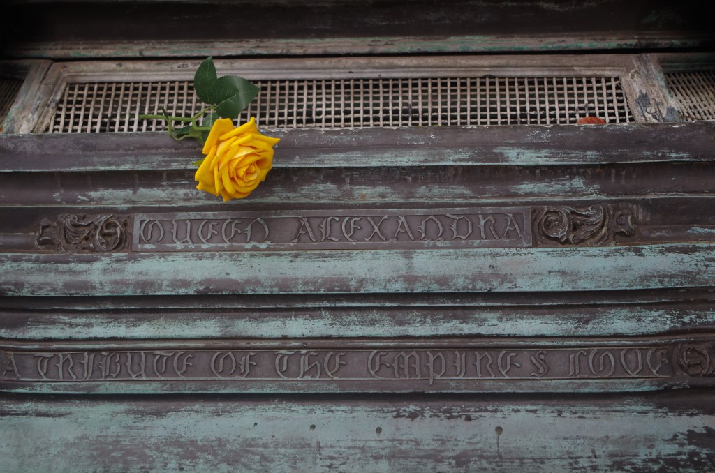 People pass by Queen Alexandra’s memorial every day on their way to and from the Mall. It’s set back from the road in an alcove and is a rippling Art Nouveau composition, if bronze can be said to ripple. I am indebted to the Tea and Morphine facebook page for featuring it and as soon as I saw it and found its location I knew I had to go and see it. I love Art Nouveau and there was an air of mystery to the sculpture. Who were the figures? Who was Queen Alexandra? The memorial is very close to the royal monument section of the Mall and, on my way, I passed tourists busily snapping away at memorials of George VI and the Queen Mother as well as walking along the Diana, Princess of Wales, memorial walk. Buckingham Palace is only a short walk away.
