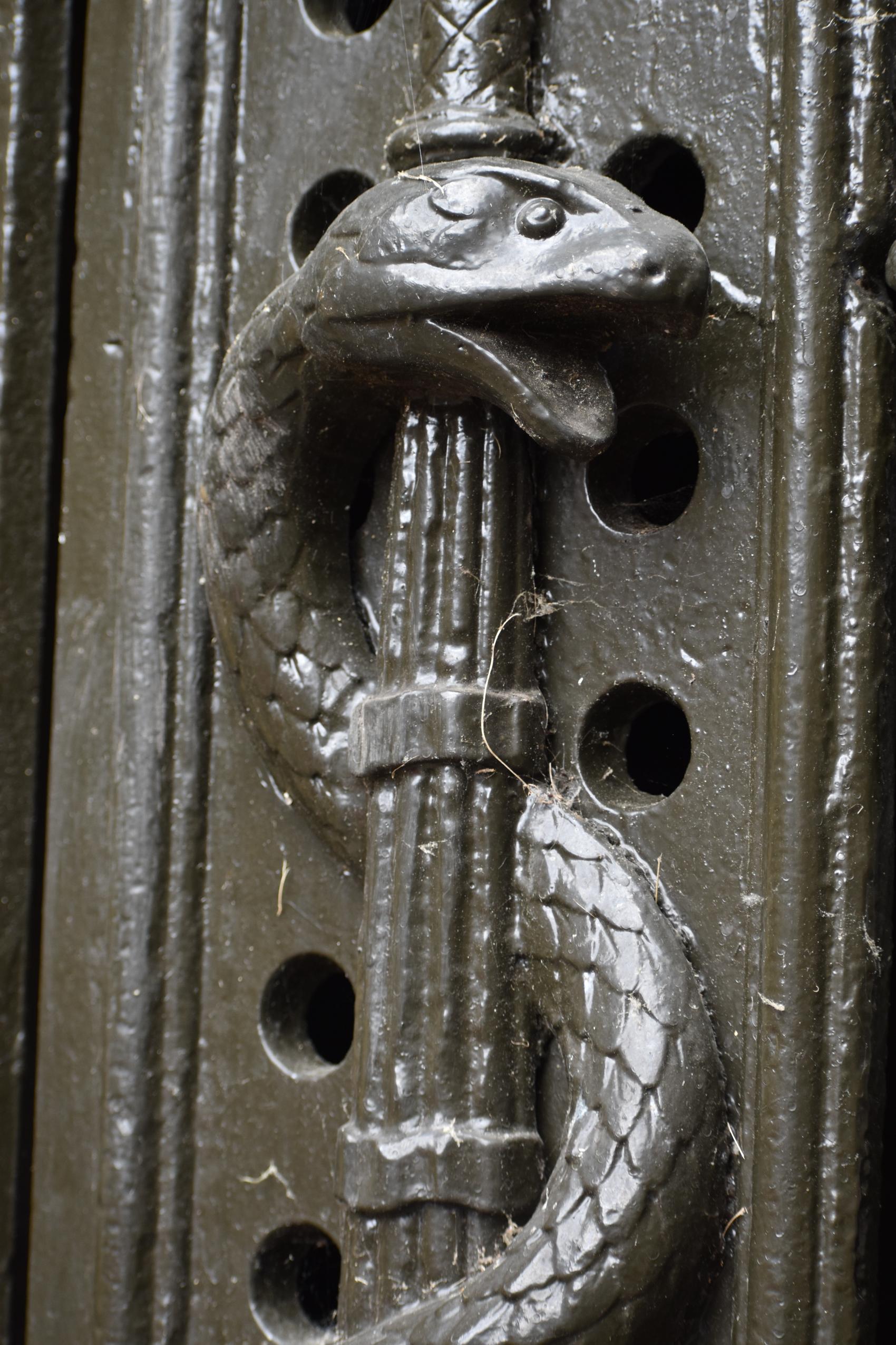 This is one of the fearsome snakes on the catacomb doors at Brompton cemetery, London. They are modern versions of memento mori.©Carole Tyrrell