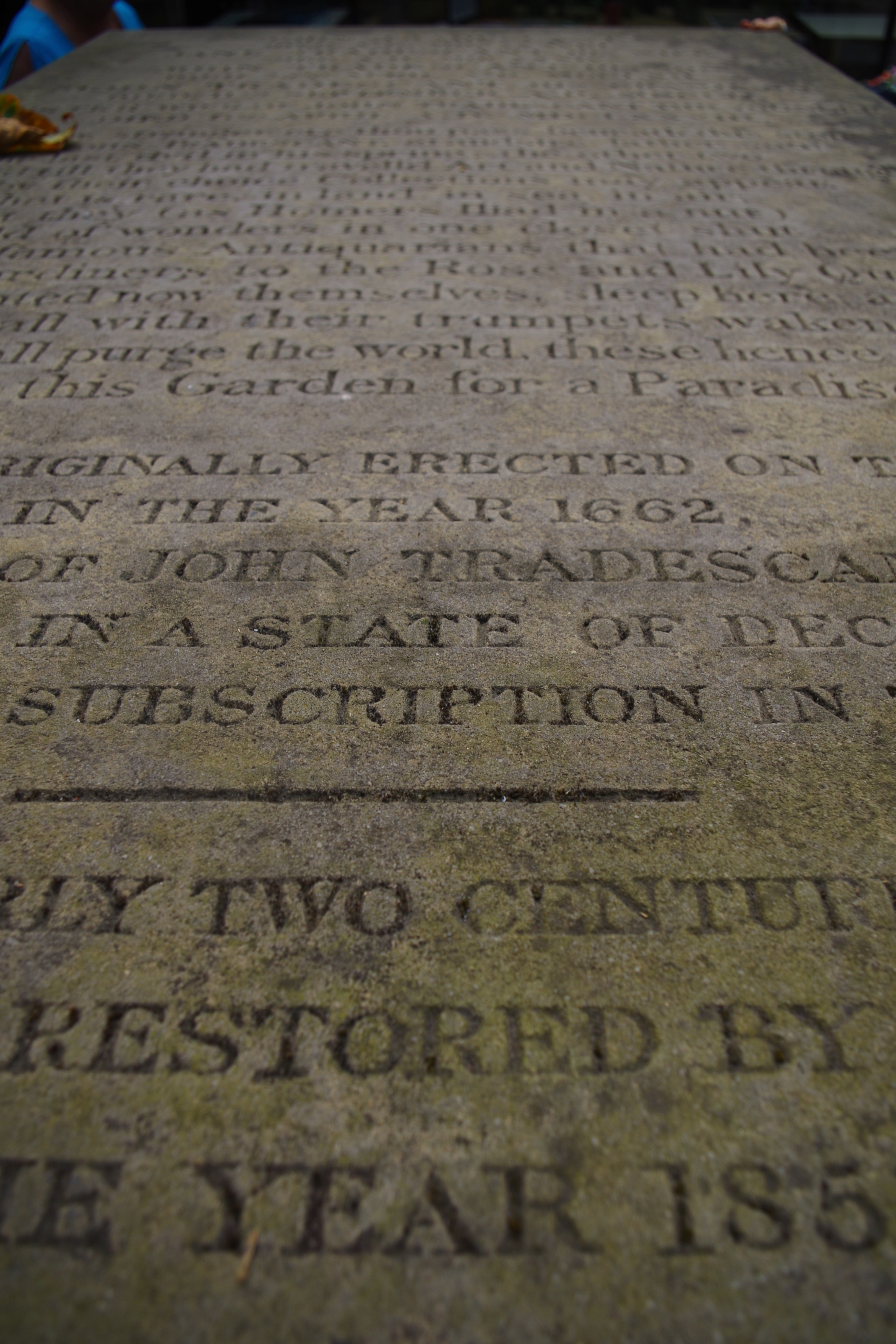 ‘Know, stranger, ere thou pass, beneath this stone Lie John Tradescant, grandsire, father, son The last dy’d in his spring, the other two, Liv’d till they had travelled Art and Nature through, As by their choice Collections may appear, Of what is rare in land, in sea, in air, Whilst they (as Homer’s Iliad in a nut) A world of wonders in one closet shut, These famous Antiquarians that had been Both Gardeners to the Rose and Lily Queen,* Transplanted now themselves, sleep here & when Angels shall with their trumpets waken men, And fire shall purge the world, these three shall rise And change this Garden then for Paradise.’