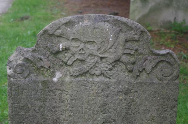 This one is near the church entrance and features a skull and crossbones with what appear to be protruding palm fronds. It also seesm to be resting on something whch may be a shield. All that can now be read on the epitaph is…who dep….’