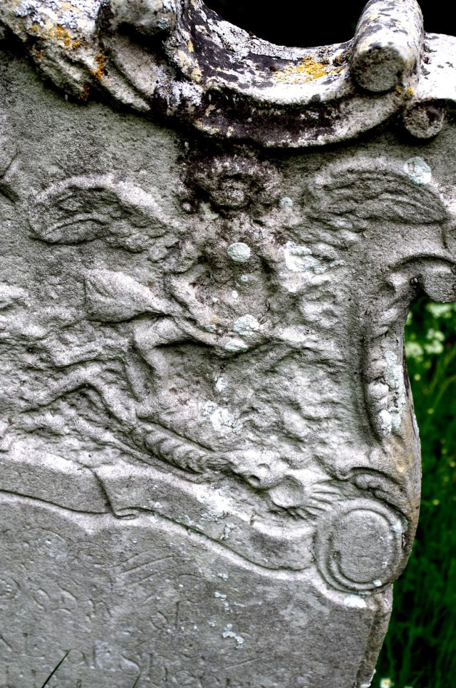 The King of Terrors is usually depicted as a skeleton brandishing a scythe, an arrow, a spear or a dart. This magnificent example comes from Cralling Old Parish churchyard in the Scottish Borders. It’s a gleeful skeleton holding a scythe which is the symbol most associated with death.