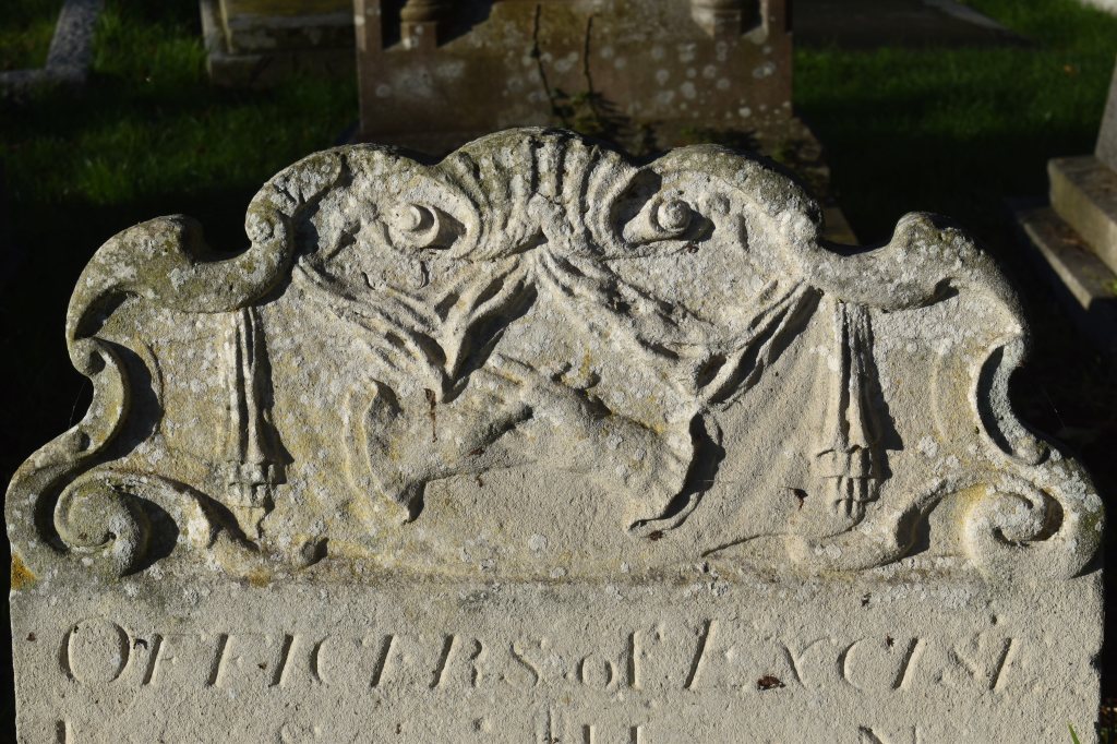 At the top of the headstone are two entwined hands, both with fashionable (at the time) frilly cuffs, and above them is what appears to be an old fashioned curtain with two drapes hanging down on either side. This could be a reference to The Final Curtain. This is often associated with the theatrical world in that it indicates the end of a show, the end of an evening, and, in funerary symbolism terms, the end of a life. The drapes on either side of the hands also resemble downturned torches which are a symbol of extinguished life. The two hands could be a variant of the ‘shaking hands’ indicating that two friends have been reunited in death. Decorative scrolls surround the images enhance the design and are typical of the period.