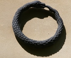 ‘In other myths the ouroboros encircles the whole world, a circumference of the waters surrounding the earth. It can support and maintain the world and also inject death into life and life into death. Although apparently immobile, it’s actually in perpetual motion, forever recoiling upon itself.’