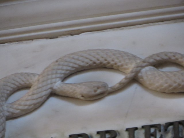The ouroboros appears in ancient churchyards and Victorian cemeteries as a symbol of resurrection. The snake is reborn as it sheds its skin and this fine example is on a mausoleum in Highgate cemetery, London. Victorian visitors would have understood its meaning. As a resurrection image it can be very positive as some of its other attributes are immortality, eternity and wisdom. However, as with most symbols , it can have several meanings. These include the Universe’s cyclic nature and life out of death and, as the snake sheds its skin it has a Phoenix-like cycle of life, death and rebirth. The Victorians revived several older symbols in a return to the classicism of ancient Greece and Rome.