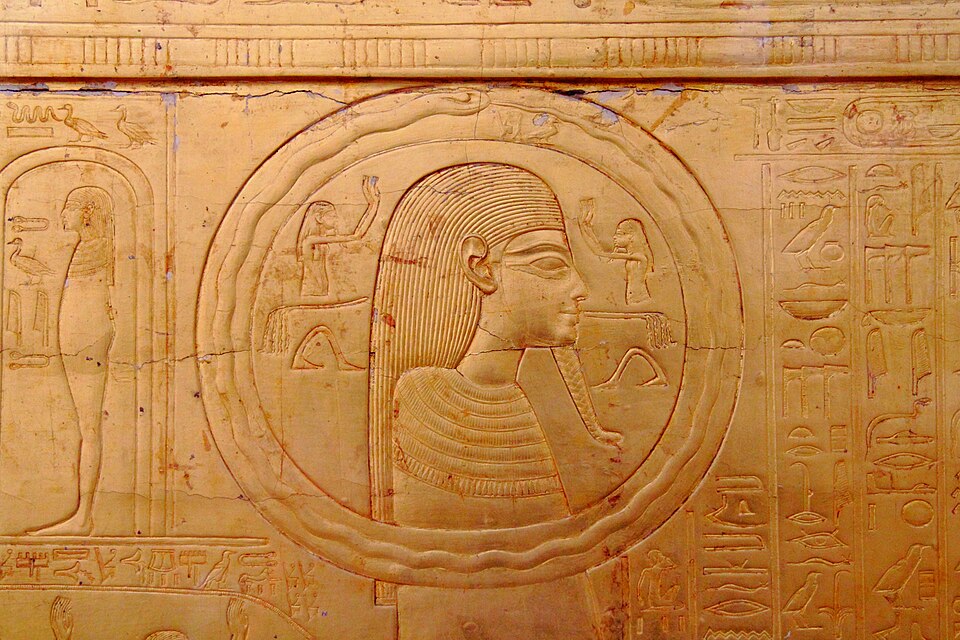 The earliest known depiction of an Ouroboros on one of the shrines enclosing the sarcophagus of Tutenkhamun. Shared under Wiki Commons. Egyptian Museum Cairo.