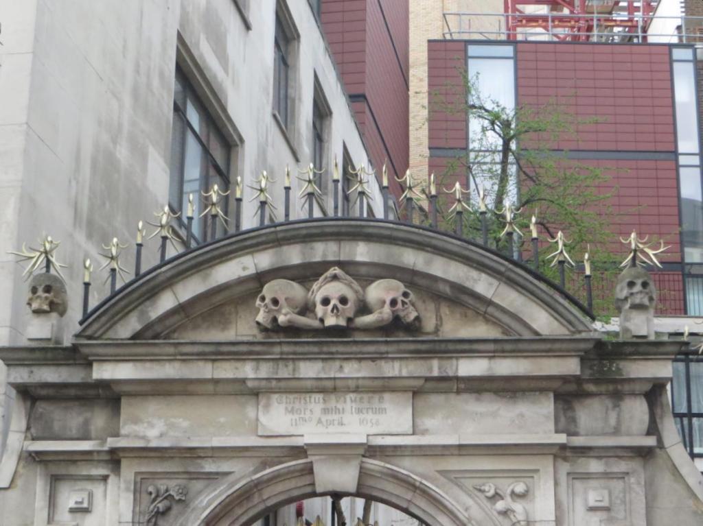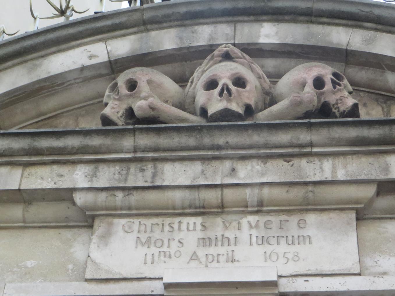 I’m sure you’ll agree that this is a very flamboyant and imposing monument. However, it is also one with great poignancy. It dates from the early 17th century and can be found in St Olave’s church, Seething Lane in the City of London. I was working in the City at the time and spent my lunch hours exploring the ancient City churches. St Olave’s is known for several grinning skulls on the entrance arch to the churchyard which dates to 1658. They impressed Charles Dickens so much that he included it in his book of sketches, The Uncommercial Traveller, in which he renamed the church, St Ghastly Grim.