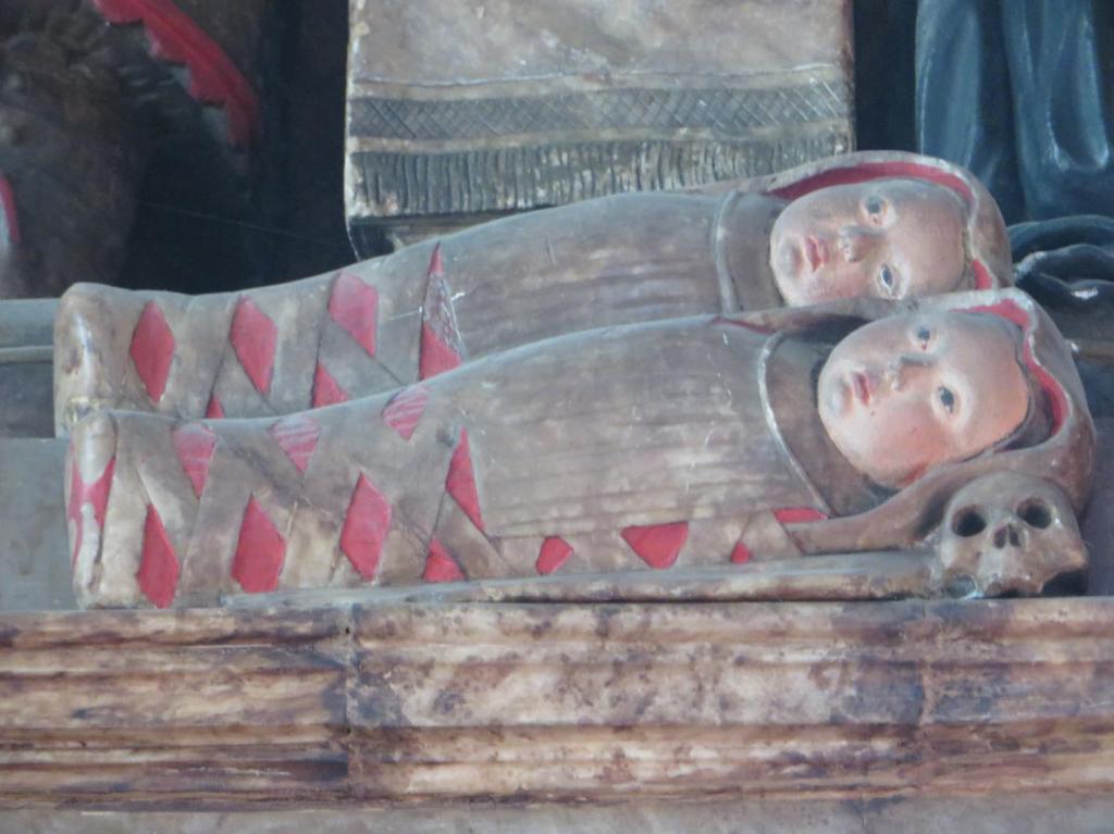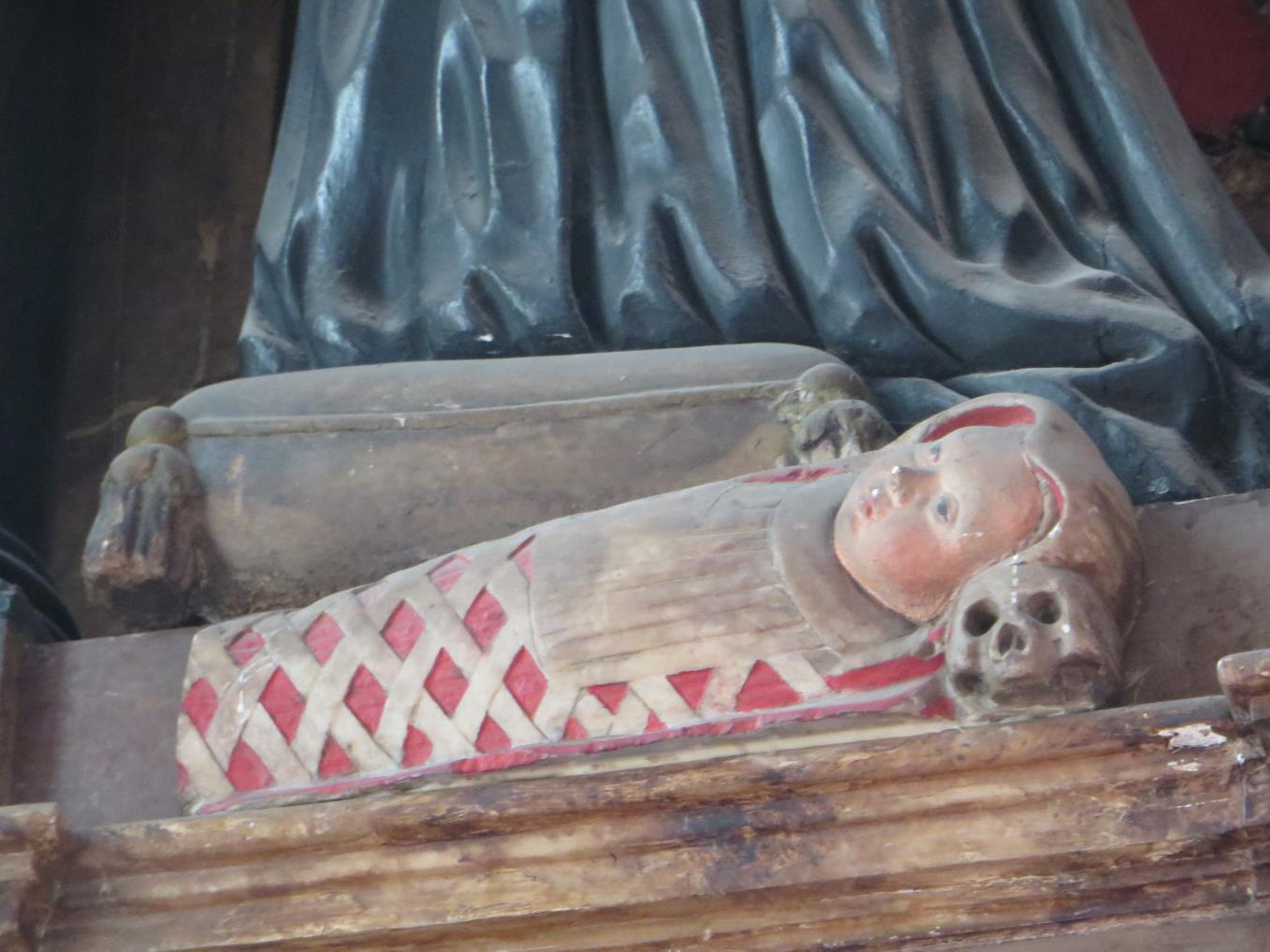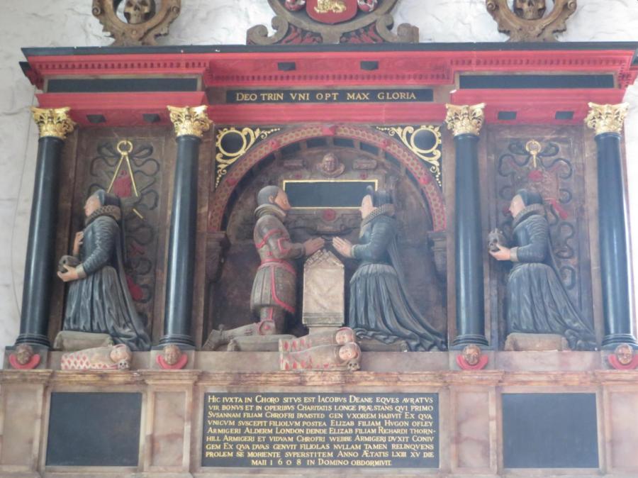 So, Sir Jacobus, or James, Deane is in good company. This would have been an immensely expensive monument when it was created and is one laden with skulls. Deane and his 3rd wife kneel, facing each other, over a prayer table which was a convention of the time. They are both fashionably dressed as she wears a ruff and bonnet in addition to her beautifully carved black gown. Jacobus himself wears dull gold armour which has been highlighted in red.