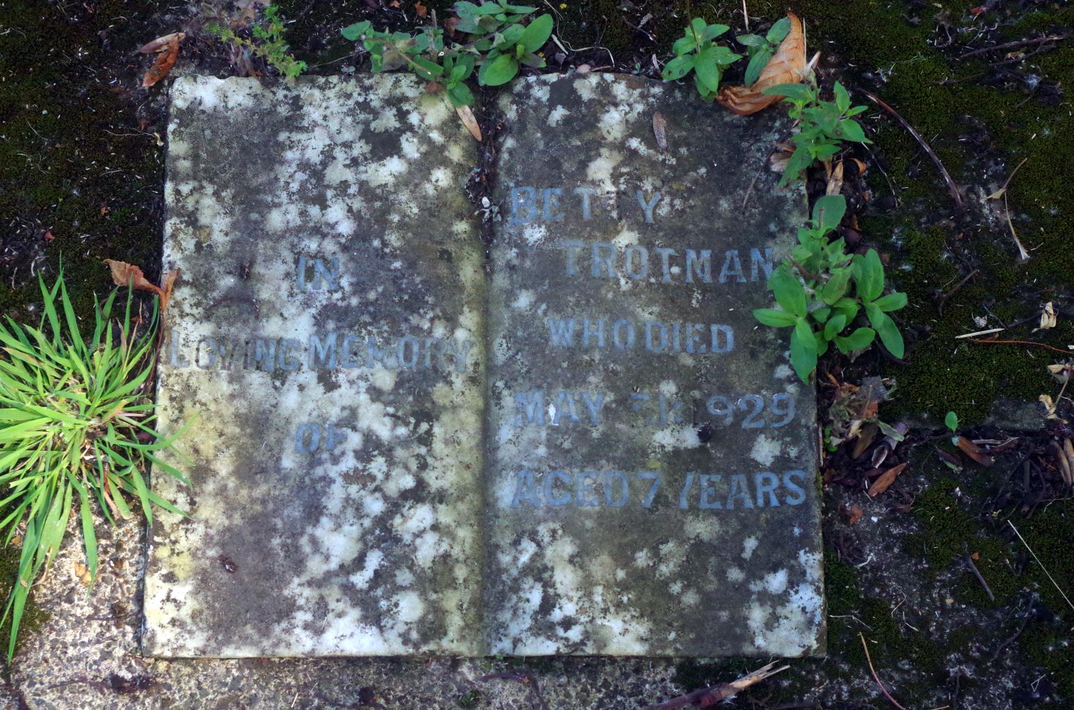 Inside Nature had taken over with a thick carpet of green brambles and undergrowth covering the entire site and it looked as if no one had been there in a very long time. Without the gates the cemetery would have just looked like a fallow field. It was impossible to see any monuments or memorials but I did find a raised concrete plinth in which 2 tombstones and a smaller Book of Life memorial had been inserted possibly to preserve them. The Book of Life was dedicated to a 7 year old named Betty Trotman and I wondered why a child was buried here. Little did I know as I closed the gate behind me that it would take me nearly 10 years to find out.