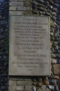 Although the memorial stone and epitaph is largely self-explanatory there is a lot more to Gosnold’s story. The explorer and colonist isn’t buried here. Instead he is reputed to lie in Jamestown, Virginia. This was the colony that he helped found and, where. according to Presevation Virgina he is regarded as being …’the prime mover of the colonisation of Virginia.’