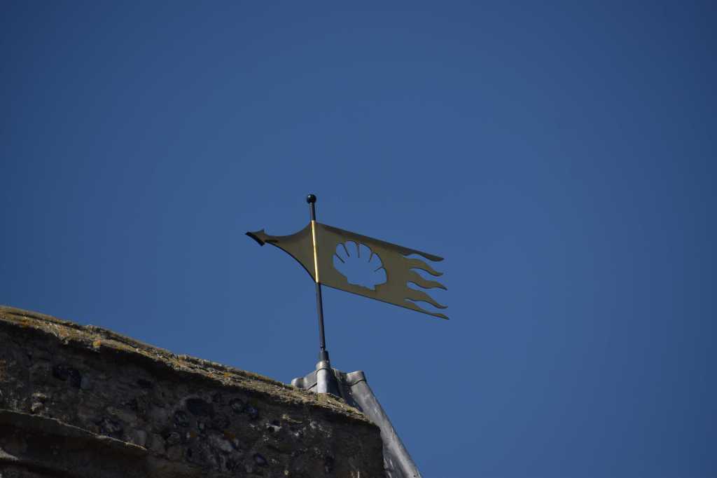 After that I went outside to see ‘Pip’s Graves’ and the table tomb on which Charles Dickens is reputed to have eaten his lunch. Across the marsh I could see docked ships and butterflies flitted about on the buddleia at one end of the churchyard. I found a clergyman’s grave denoted by a chalice and more childrens graves. One was dedicated to a six year old. I also pursued a Common Darter dragonfly until it posed obligingly and checked to see if the little grinning demon still kept watch over the outside loo. He did. I looked up as I left the churchyard and saw, glinting on the weathervane above the tower the representation of another cockleshell.