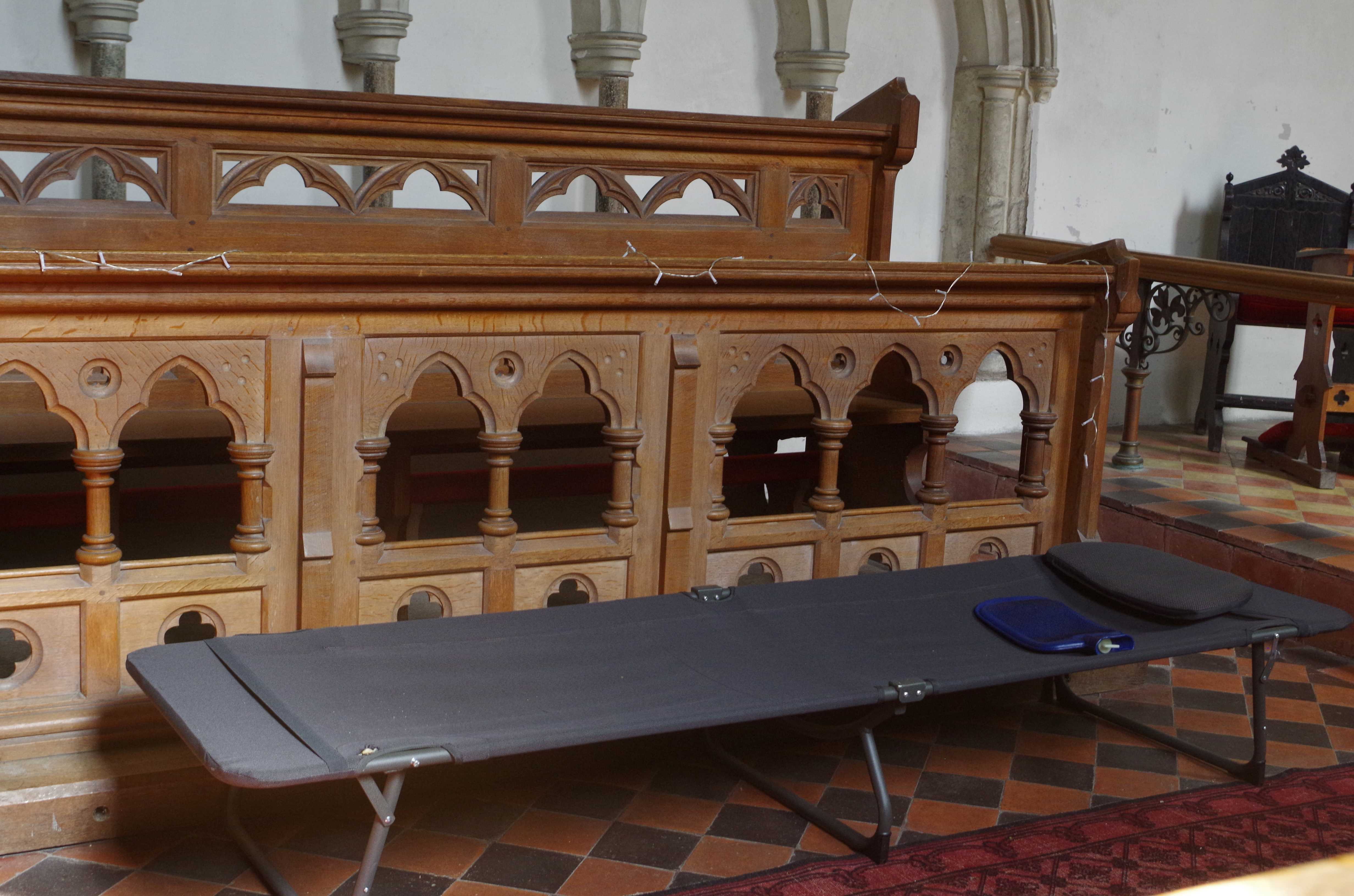 Maybe I just disturbed the nocturnal guests at St James’s and they felt compelled to hide but all appeared to be silent as I stepped inside the church. But they were given away by 2 vacant camp beds in front of the altar and the small refreshment area by the pulpit. I thought that the hot water bottle on one of the camp beds was a nice touch as I stood there for a moment and wondered what it must have been like staying overnight in an empty church in such an isolated place. There are houses around the church but not that many. ‘Champing’, is a euphemism for overnight ‘camping’ in churches looked after by The Churches Conservation Trust. Don’t worry they’re not pitching tents! The church provided the campbed and the usual amenities. It’s really caught on in recent years and I have been tempted to try it myself.