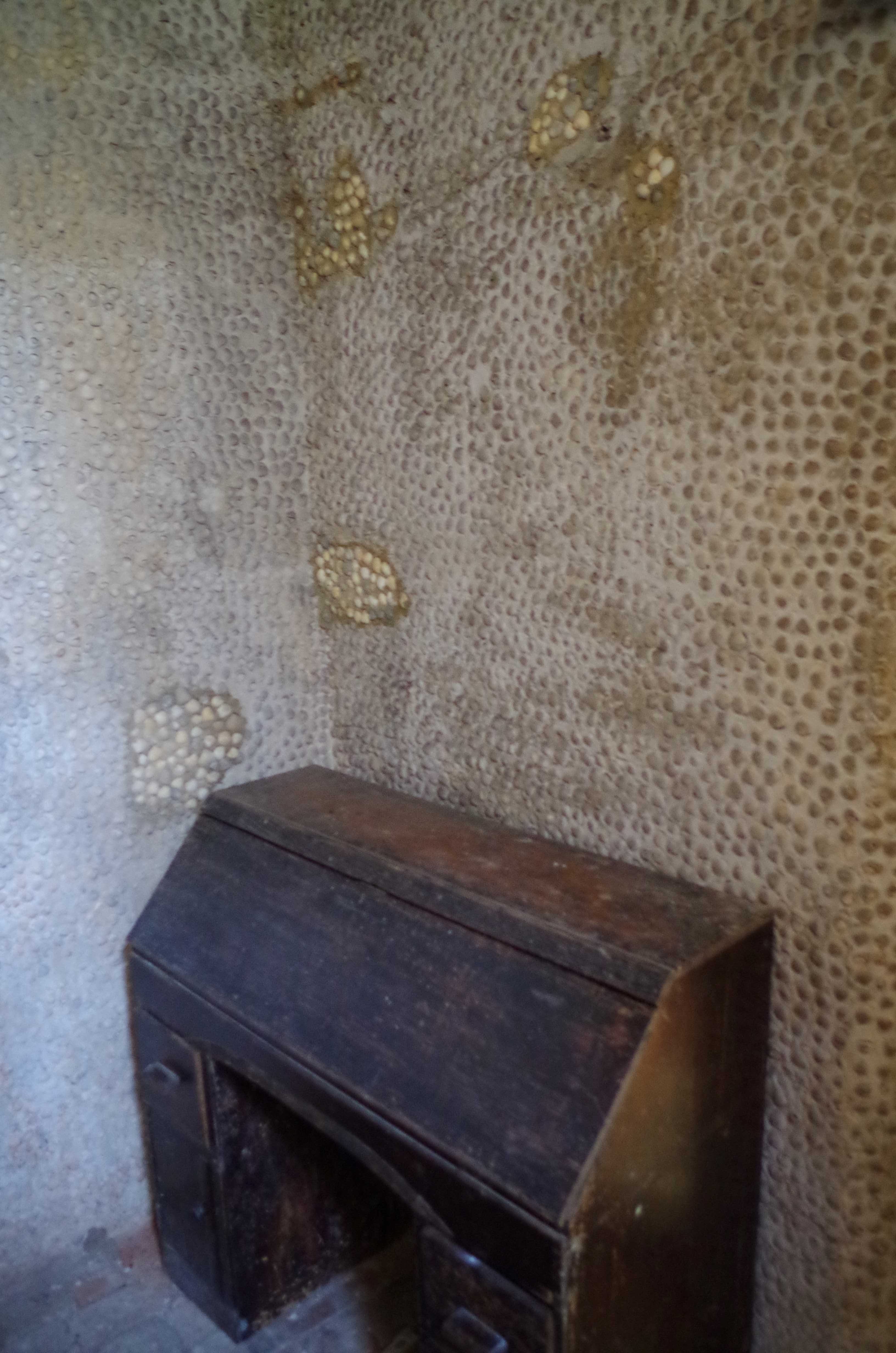 But I was at St James’s to see the cockleshell room which I’d missed on earlier visits. There wasn’t a sign advertising it but a quick look at the church map of the interior and I headed for the church organ. This time I found it! The door’s latch seemed to echo in the tranquillity as I pulled it open. The vestry is ‘compact and bijou’ as an estate agent would undoubtedly say – it is tiny and there was only a small open cobwebbed window, high up in the wall for ventilation. The room felt very warm and contained only a chair, possibly a recycled pew, and a bureau.
