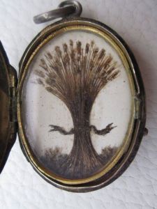According to the art of mourning website, the wheatsheaf was also a very popular motif in Victorian mourning jewellery. In fact they have suggested that it could be seen as a memento mori in that it denotes life cut and renewal or resurrection of the soul. Its heyday was during 1820-1860 and it also survived into early 20th century mourning jewellery just as it was going out of fashion. The wheatsheaf was often found in mourning wreaths, brooches, lockets and rings and was an effective emblem when working with hair to create these pieces.